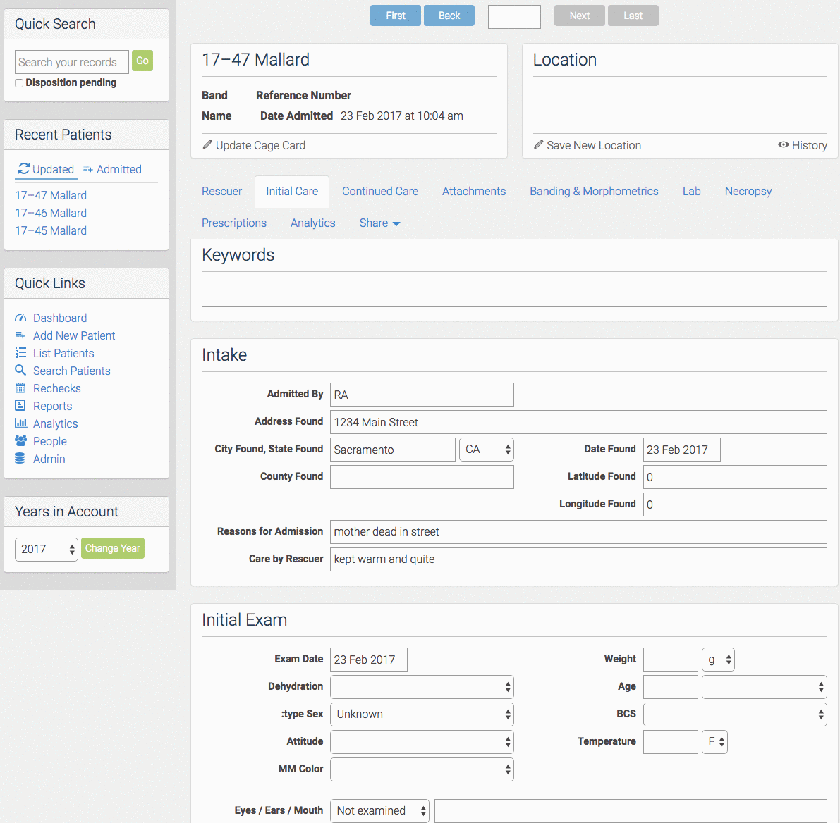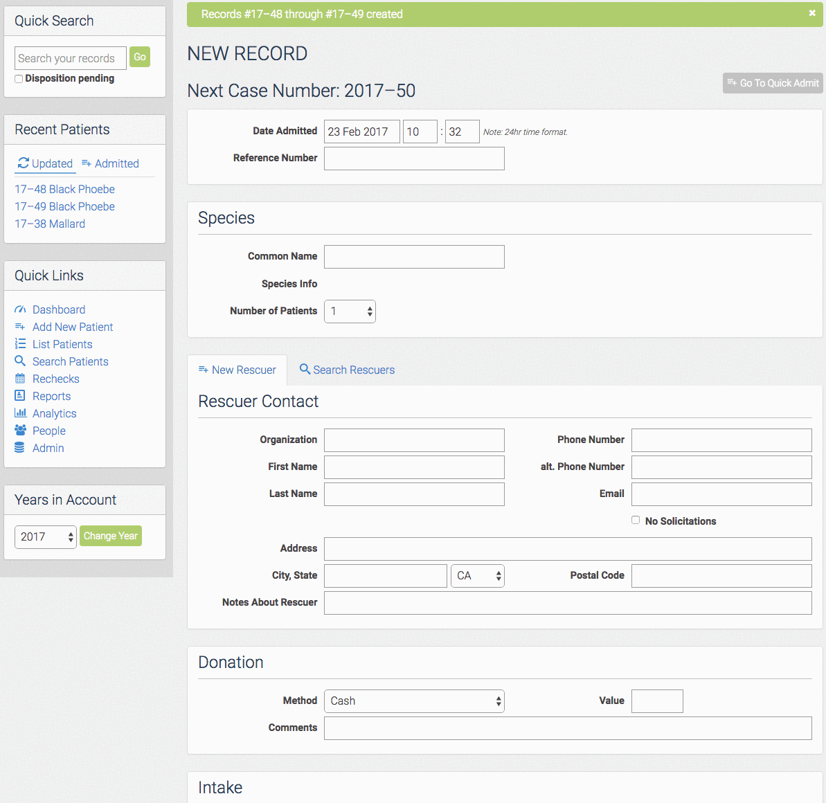 Example 2 - Though Bob Smith is really nice his records are beginning to give you a head ache. Two hours after Bob Smith leaves, he is back with 2 more mallard ducklings. There have been a few admit's since he left. What you can do now, is go to any one of those mallard's record. Go to "Share" and "Duplicate Record". It will give you the choice on how many to duplicate, you would choose 2. All the information will be the same. Next you create the 2 new records. Now all 12 records are attached to one another and linked by Bob Smith's information.