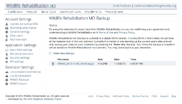 There is often a concern about losing data. We at The Wild Neighbors Database Project agree that loss of data would be a tragedy. We have taken several precautions to eliminate this from happening. We can never be 100% sure of anything when it comes to data. If your data is on paper there could be a fire or if it's on a server, the server could be damaged. There could be any number of creative ways it could disappear no matter what we do to protect it.Wildlife Rehabilitation MD Backup is designed to put our users minds at ease. At anytime you can backup all of your data in your account to your computer, flash drive, dropbox account, etc. If you ever decide to leave WRMD you can take your data with you.