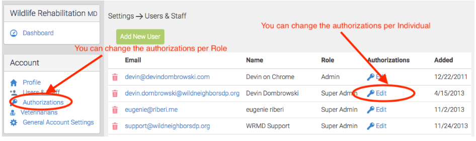 We have created a new feature called Authorizations. Within "Settings" if you have access, you will see an "Authorizations" link. We have defaulted these features to certain "Roles". You can now change the Authorizations of the entire Role or you can change an Individuals "Authorizations" by going to "Users and Staff" and clicking on the "Edit" icon associated with that persons name.